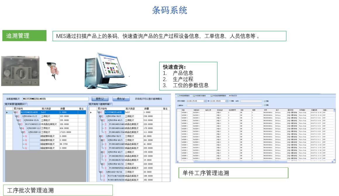 机台设备对应单个智能终端系统,实现机台唯一管理机台生产数量报工,不良品质量原因码区分,实时机台状态展示(包括设备机台停机上料等),从而实现机台OEE、利用率实时展示,产品可以实现多批次/单件管理追溯多工序多站点流程追溯管理,出货产品可以按照箱/栈板出货实现有效追溯.